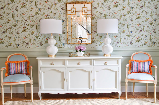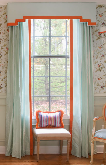I wanted them to feel modern and not too heavy or "old school" traditional so scale and proportion were so important. The material had to be silk for its lightness. Trim had to be a bright orange. One thing I've learned over the years is when you add trim to a fabric it can change the look/color/brightness of a fabric so I chose to go with the lighter mint color silk and add a darker brighter trim.